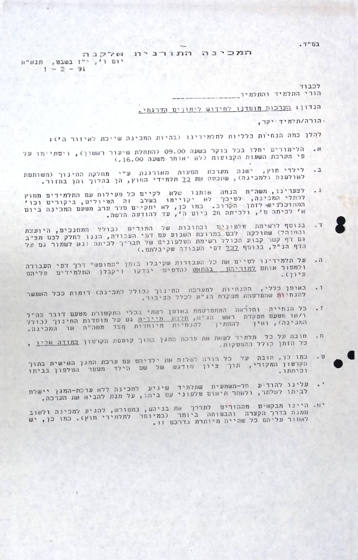 אגרת לתלמידים (20/01/1991)