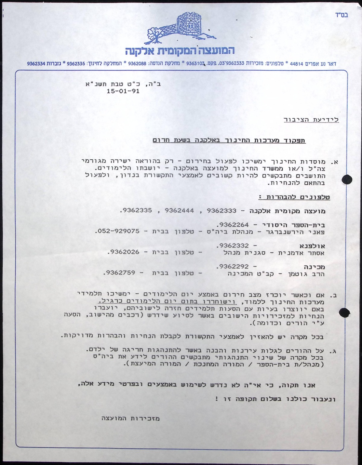 תפקוד מערכת החינוך באלקנה בשעת חרום (15/01/1991)