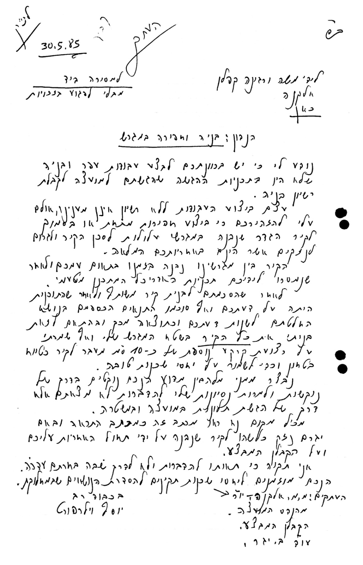 תכתובת בין יוסי ושלומית וילרפורט למשה ורגינה קפלן בנוגע לקיר התומך בין שני המגרשים.