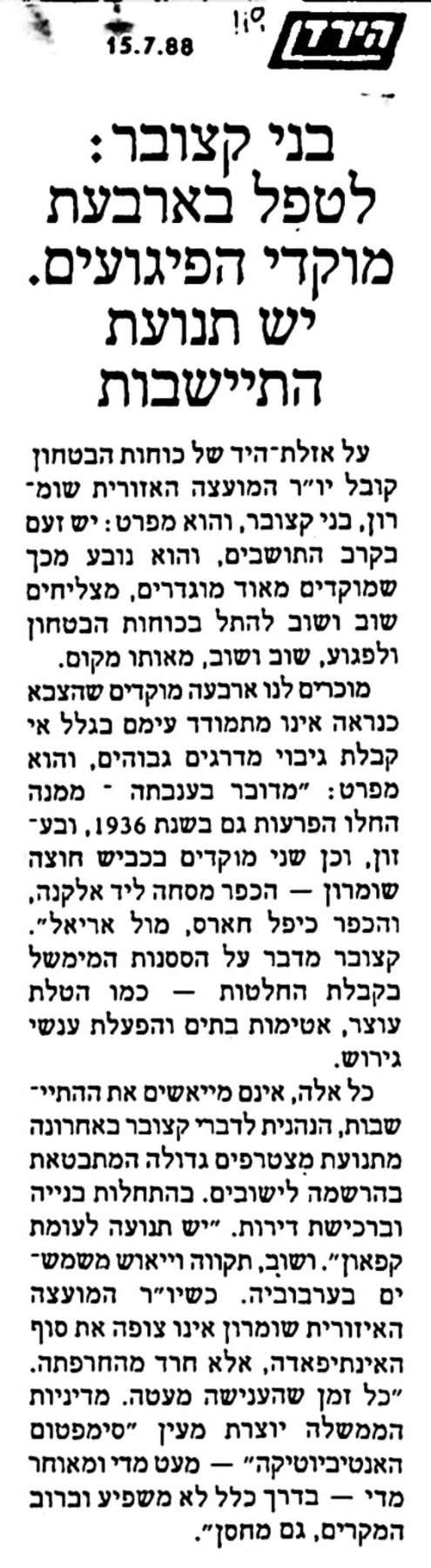 האינתיפאדה החלה ב-9 בדצמבר 1987 והתאפיינה בתחילתה בעיקר בהפרות סדר המוניות שכללו הפגנות, ידויי אבנים, חסימות צירים ובמקרים מסוימים גם השלכת בקבוקי תבערה. בהמשך שינתה האינתיפאדה את אופיה, ומ-1989 החלו להתבצע פיגועים בעיקר על-ידי הארגונים האסלאמיים, "חמאס" ו"ג'יהאד איסלאמי".